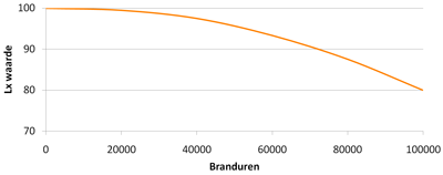 We kunnen hierdoor veilig lineair extrapoleren. Stel we hebben L80 bij 100.000 branduren. Dan zal het bij 50.000 branduren minstens L90 zijn en bij 25.000 branduren minstens L95.
