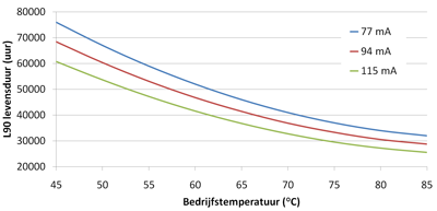 Afbeelding 1: voorbeeld van L90 levensduur, bij hogere stroom en bij hogere bedrijfstemperatuur neemt de L90 levensduur af.