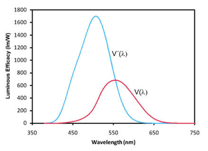 Afhankelijk van de hoeveelheid blauw in het spectrum nemen we bij scotopische lichtniveaus door de hogere gevoeligheid van de staafjes meer of minder licht waar dan bij fotopische lichtniveaus. Deze verhouding staat bekend als de S/P ratio (S = scotopic, P = photopic). Met veel blauw in het spectrum nemen we meer licht waar en is de S/P ratio groter dan 1, met weinig blauw in het spectrum nemen we minder licht waar en is de S/P ratio kleiner dan 1.