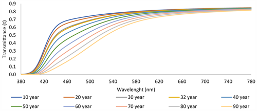 Afbeelding: hoeveel licht van welke golflengte de ooglens doorlaat per leeftijd (blauw licht heeft een golflengte rond 460 nm).