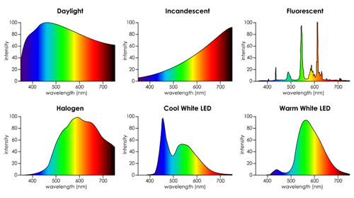 In bovenstaande afbeelding is te zien dat LED gekenmerkt wordt door een blauwe piek in het spectrum. Bij hoge kleurtemperaturen (koel wit) is die piek groot, bij lage kleurtemperaturen (warm wit) is die piek klein.