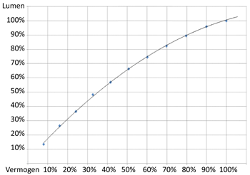 Afbeelding: voorbeeld van een verhouding tussen lumen en vermogen (rendement neemt toe naarmate er meer gedimd wordt).