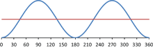 Hierboven het vermogen zonder faseverschil tussen spanning en stroom. De blauwe lijn is het verloop van het vermogen, de rode lijn het gemiddelde (het actieve vermogen). De blauwe lijn beweegt hier tussen 0 en 1. Het actieve vermogen is altijd positief (spanning en stroom zijn ofwel beiden positief ofwel beiden negatief). Terzijde: de frequentie van het vermogen is twee keer die van spanning en stroom, per cyclus van 360 graden worden de maximale en minimale waarde twee keer in plaats van één keer bereikt.