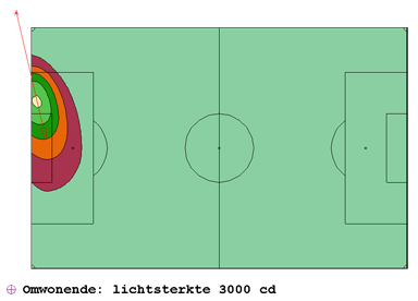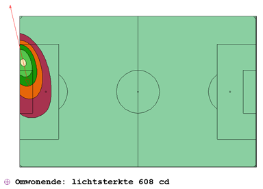 We kijken voor het effect van het in de software richten met twee of drie assen naar een voorbeeld. In de afbeelding hieronder hebben we linksboven een armatuur in de hoek van een voetbalveld en linksonder een omwonende (aangegeven met een + in een rondje). De armatuur bestaat uit een aantal modules die aan een schuine stang bevestigd zijn en om de modules te richten worden ze om een schuine as gedraaid. In de afbeelding zien we één module die gericht is om licht te geven voor het doel. In de software is deze gericht met twee assen (wat niet overeenkomt met hoe de module in werkelijkheid gericht wordt). De lichtsterkte voor de omwonende van deze ene module is volgens berekening 608 cd.